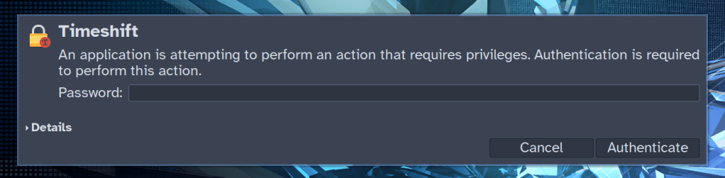 For instance, the backup app timeshift needs elevated permissions to open. If everything is working fine when I launch it, I should see this prompt pop up: