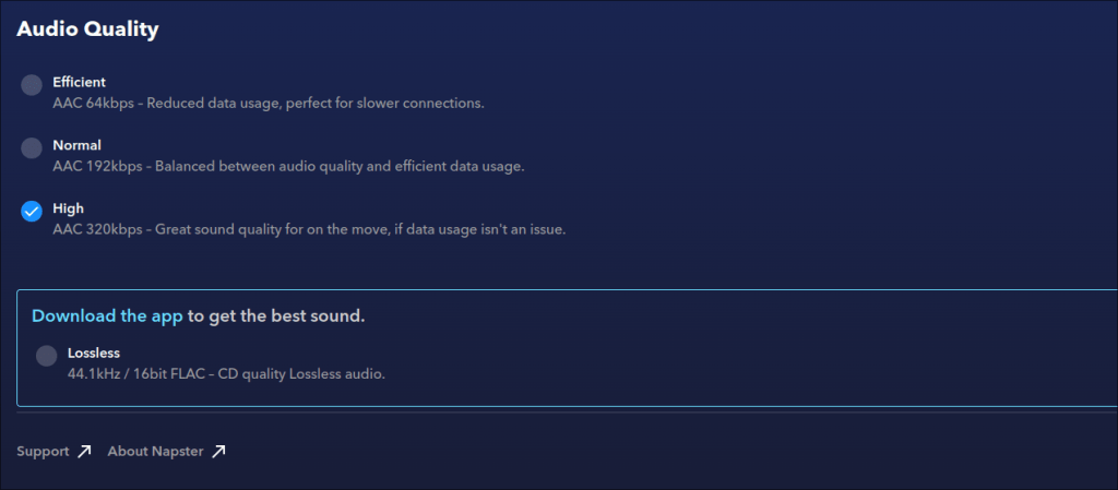 The highest quality audio is only available on the app. If you’re using the web player, you need to install the app and listen through there for the best possible experience. For a few days, when I was driving with the Napster app on my phone, this was no big deal. I got the sound quality I wanted and everything was fine.