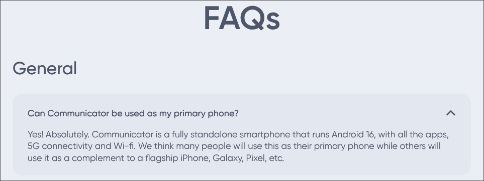 The Communicator looks like the real star of the show, and that’s also despite how the marketing keeps pushing it as a “secondary” phone and companion device to a flagship. It took a lot of people asking in the YouTube comments on the launch announcement (and probably on social media as well) for the site to add to the FAQ that yes, the Communicator can be used as a primary phone. Thankfully that is the case, as the idea of swapping SIMs repeatedly or having to pay for another line seems unappealing.